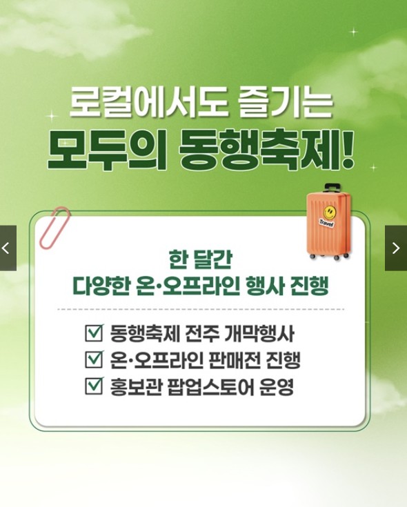 동행축제는 일정 기간 동안 집중적으로 운영되는 행사로, 온라인과 오프라인이 동시에 진행됩니다. 동행축제는 크게 온라인 판매전, 오프라인 판매 행사, 지역 연계 프로그램으로 구성됩니다. 이러한 구조 덕분에 단순 구매를 넘어 체험과 관광까지 함께 즐길 수 있는 특징이 있습니다.